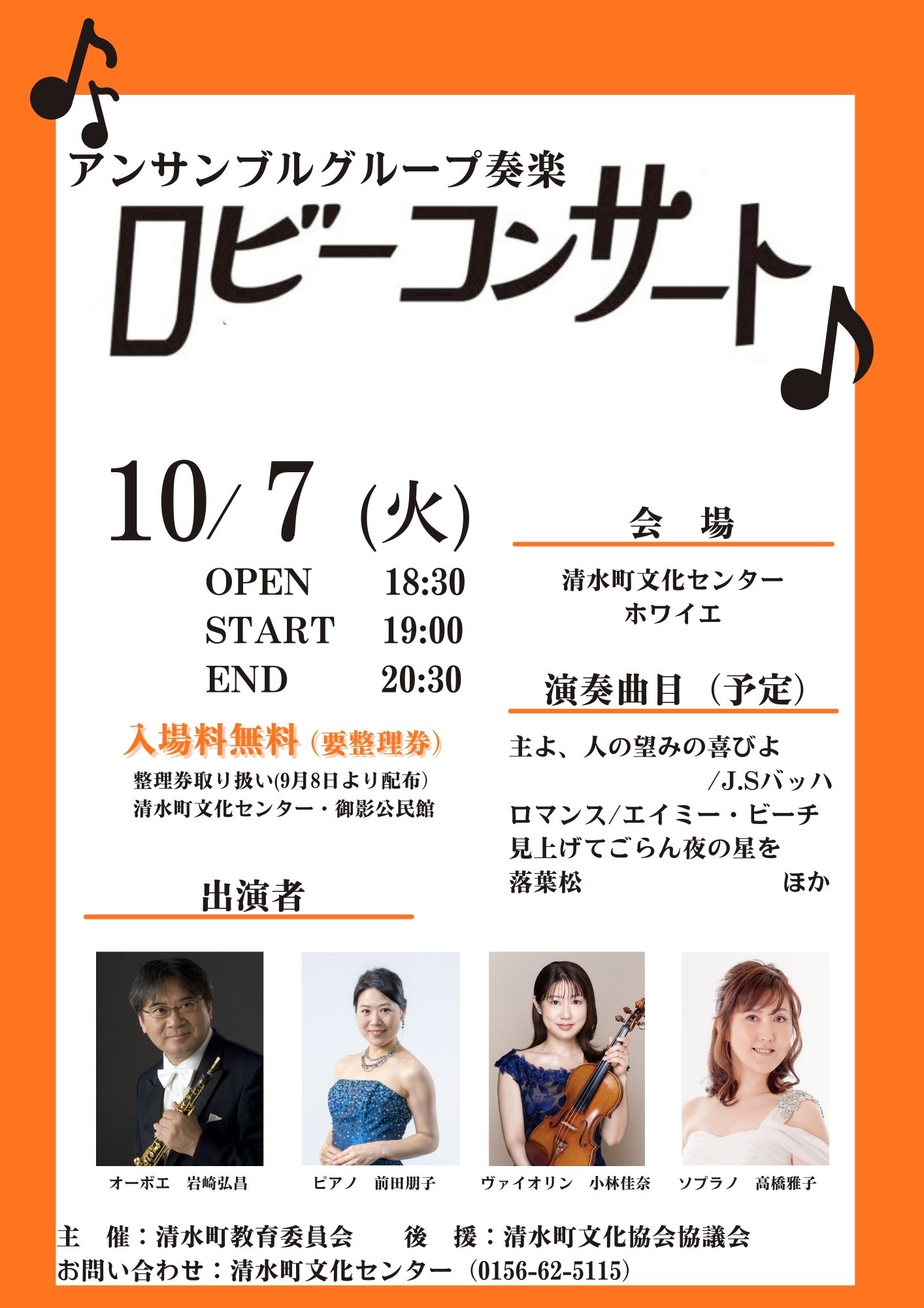 ♪清水町・ロビーコンサート(10/7 19:00開演、清水町文化センター・ロビー)