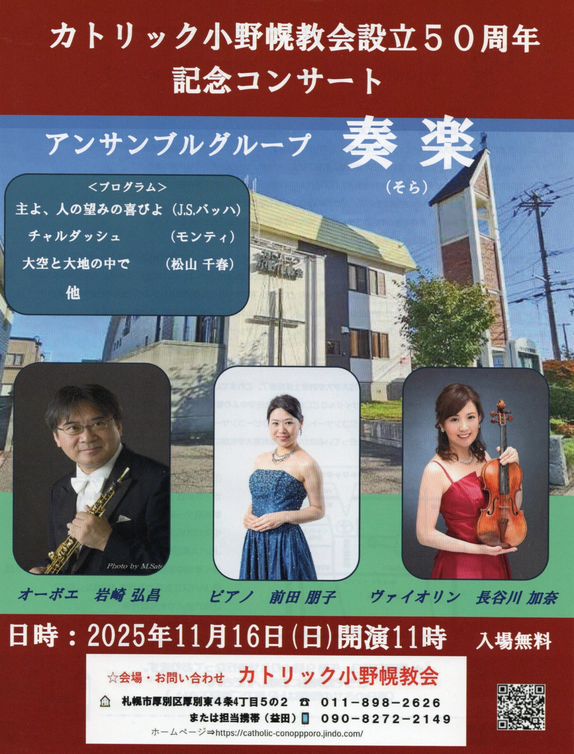 いつも応援してくださっている、カトリック小野幌教会にて、数年ぶりに演奏させていただきます。