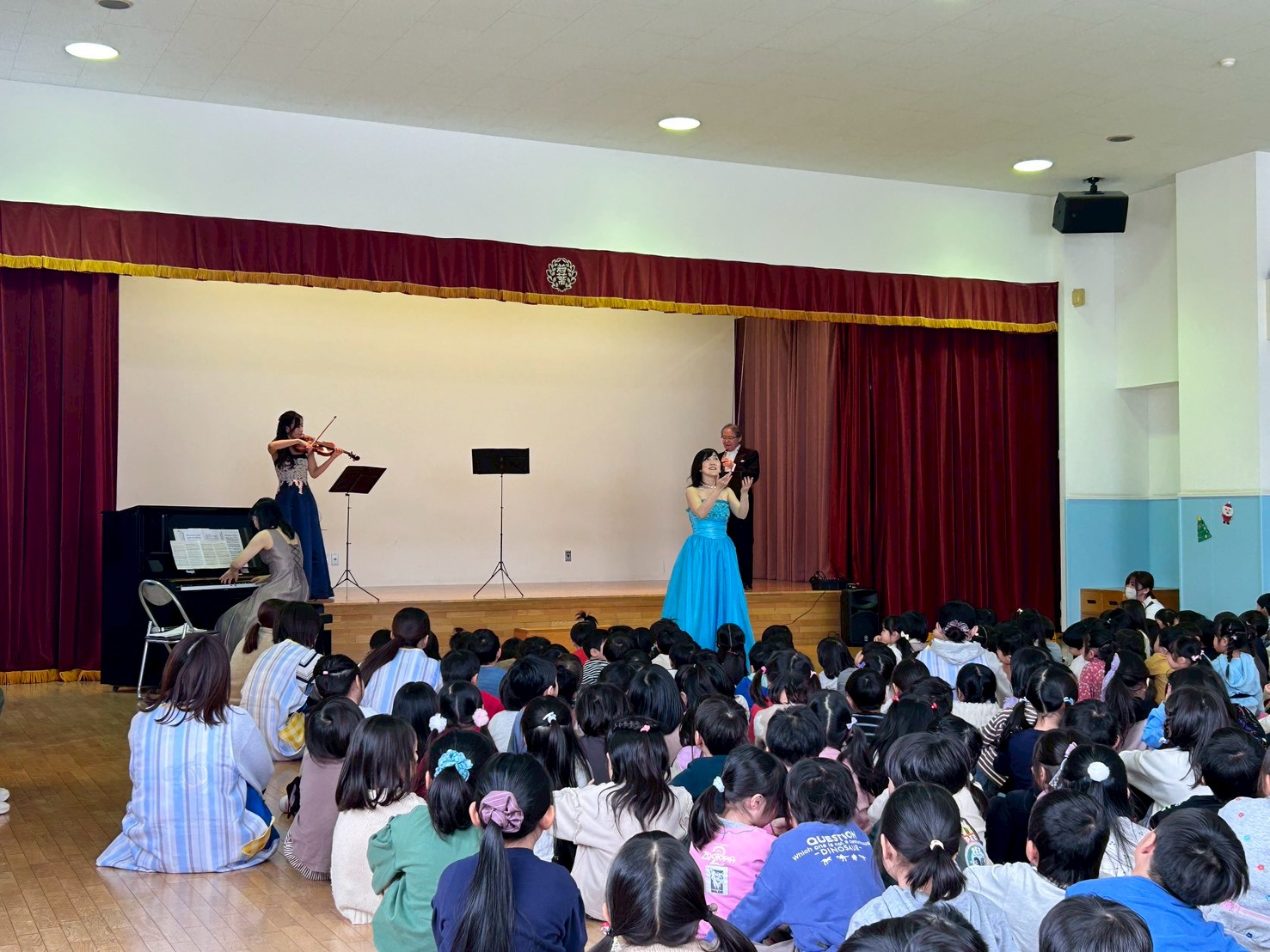 (写真は順に 日高町立厚賀小学校、釧路かすみ幼稚園、札幌若葉幼稚園での演奏の様子です)