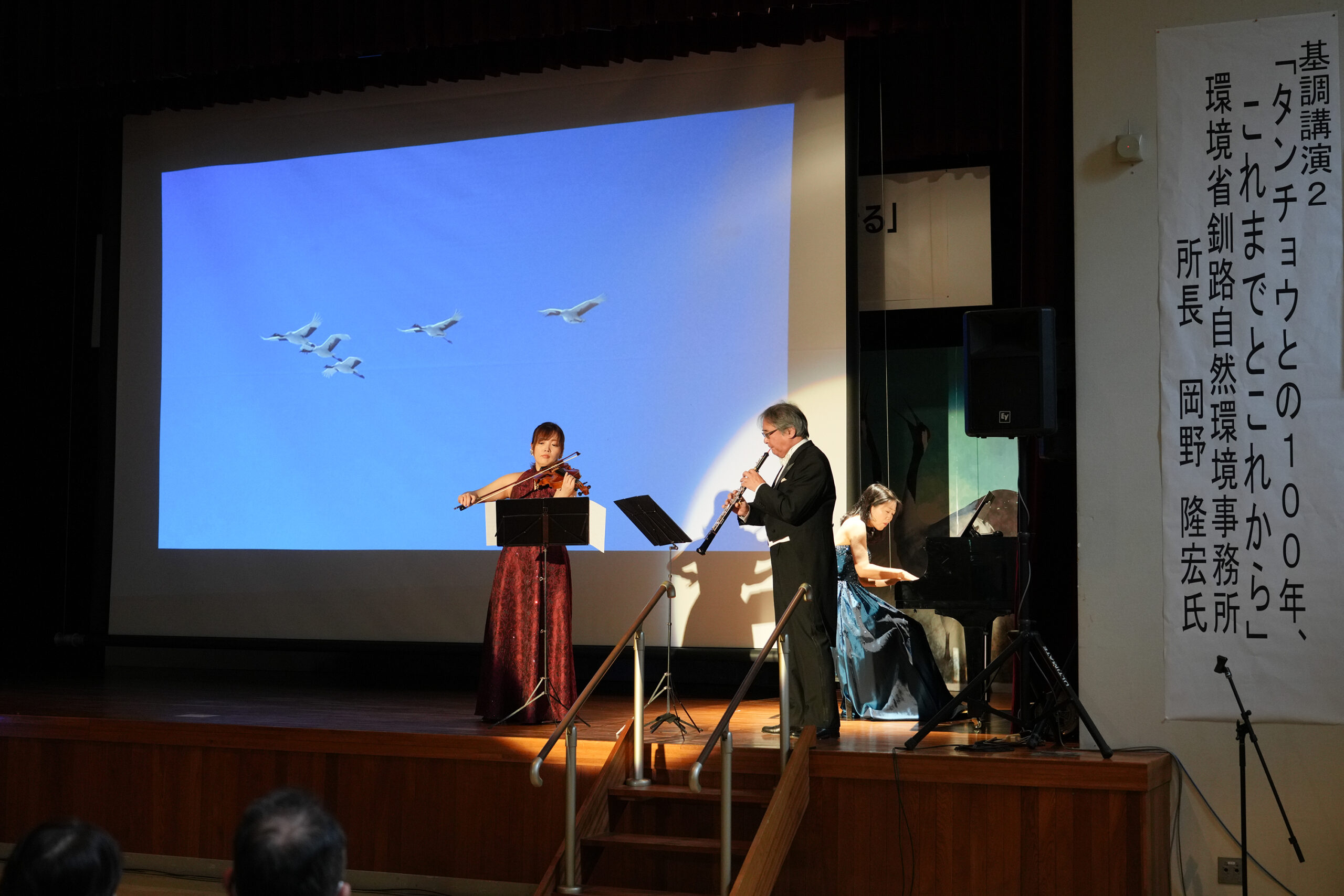 (写真は、恵庭市長寿大学、鶴居村タンチョウ再発見から100年記念での演奏の様子です)