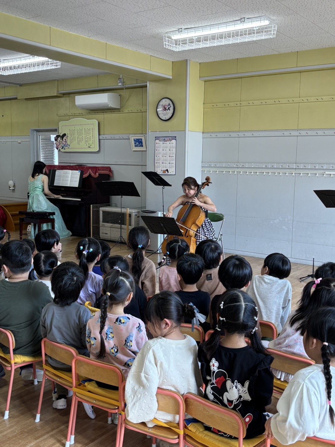 (写真は順に 日高町立厚賀小学校、釧路かすみ幼稚園、札幌若葉幼稚園での演奏の様子です)